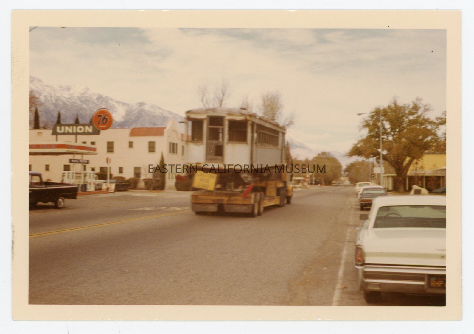 1991.27.1.44--Color photo of a flatbed truck hauling a train car (the Galloping Goose or Blue Goose?) through Independence on Edwards Street (Highway 395). The Winnedumah Hotel and a Union 76 gas station are visible.