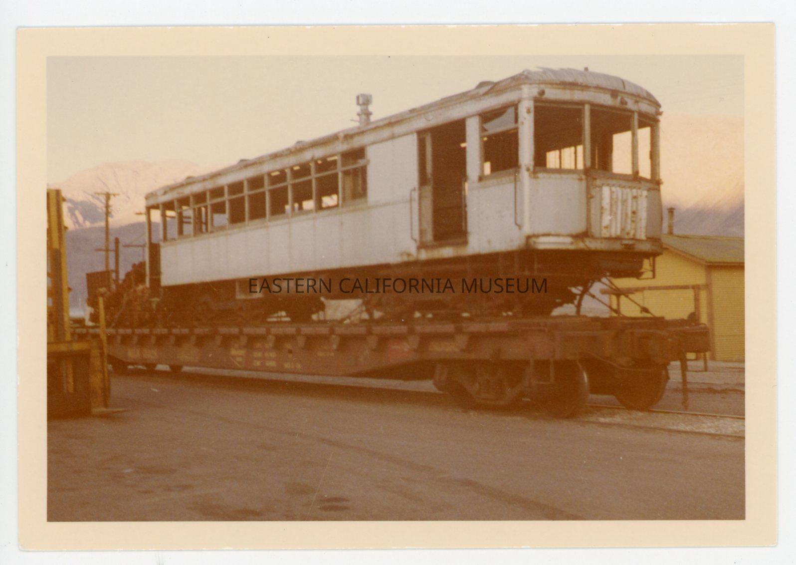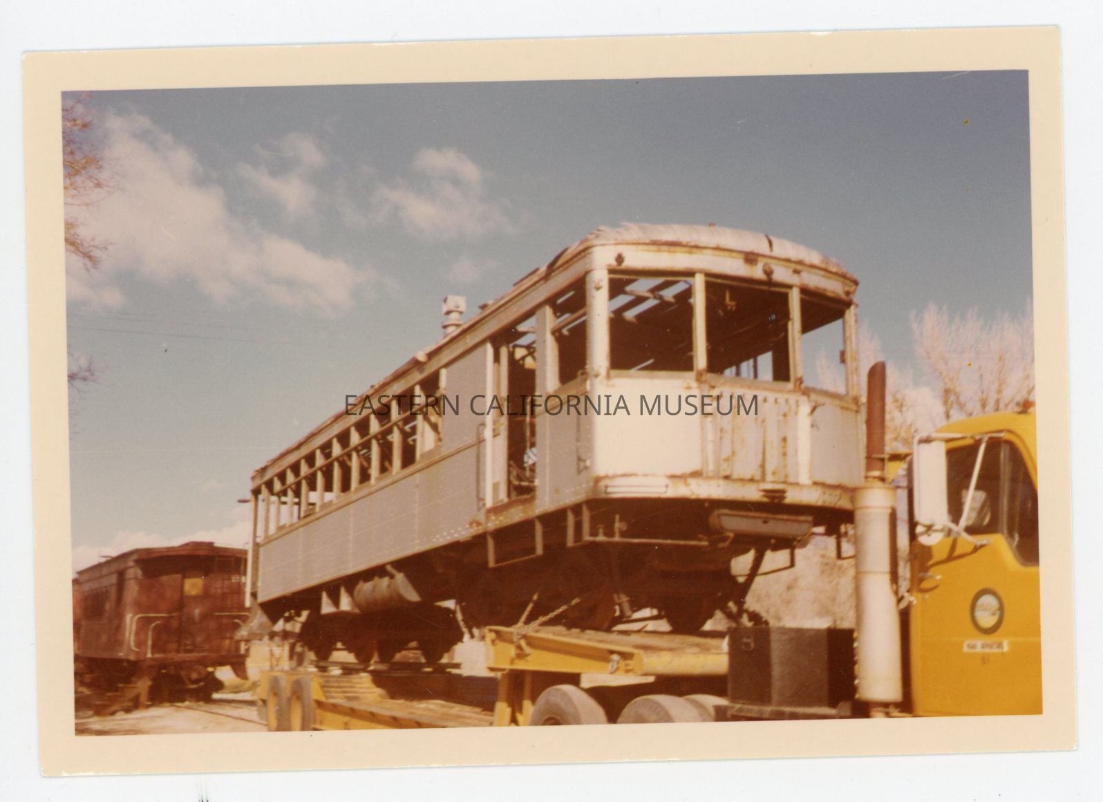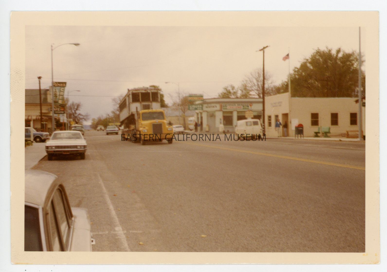 1991.27.1.43--Color photo of a flatbed truck hauling a train car (the Galloping Goose or Blue Goose?) through Independence on Edwards Street (Highway 395). The Pines Cafe building, current Post Office, and a building that may be the Intertribal Office are visible.