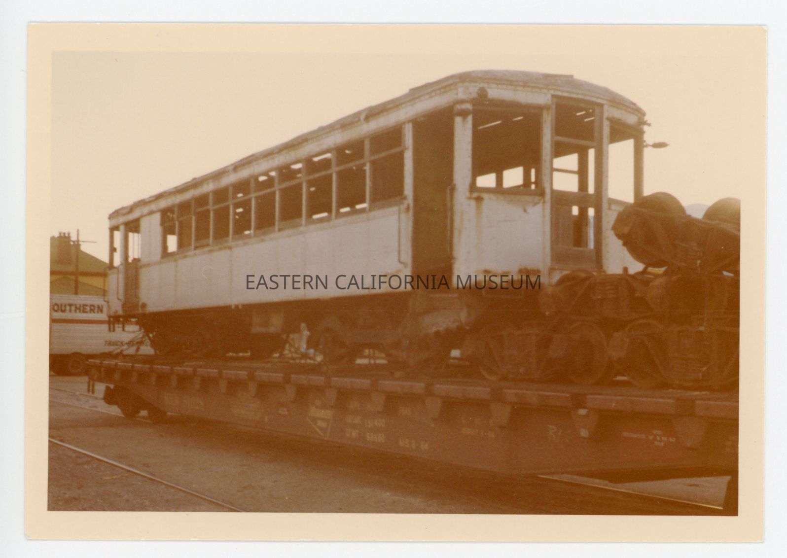 1991.27.1.48--Color photo of a flatbed truck hauling a train car (the Galloping Goose or Blue Goose?) and a pile of what may be train wheelsets or other machinery. There is a Southern Pacific truck in the background.