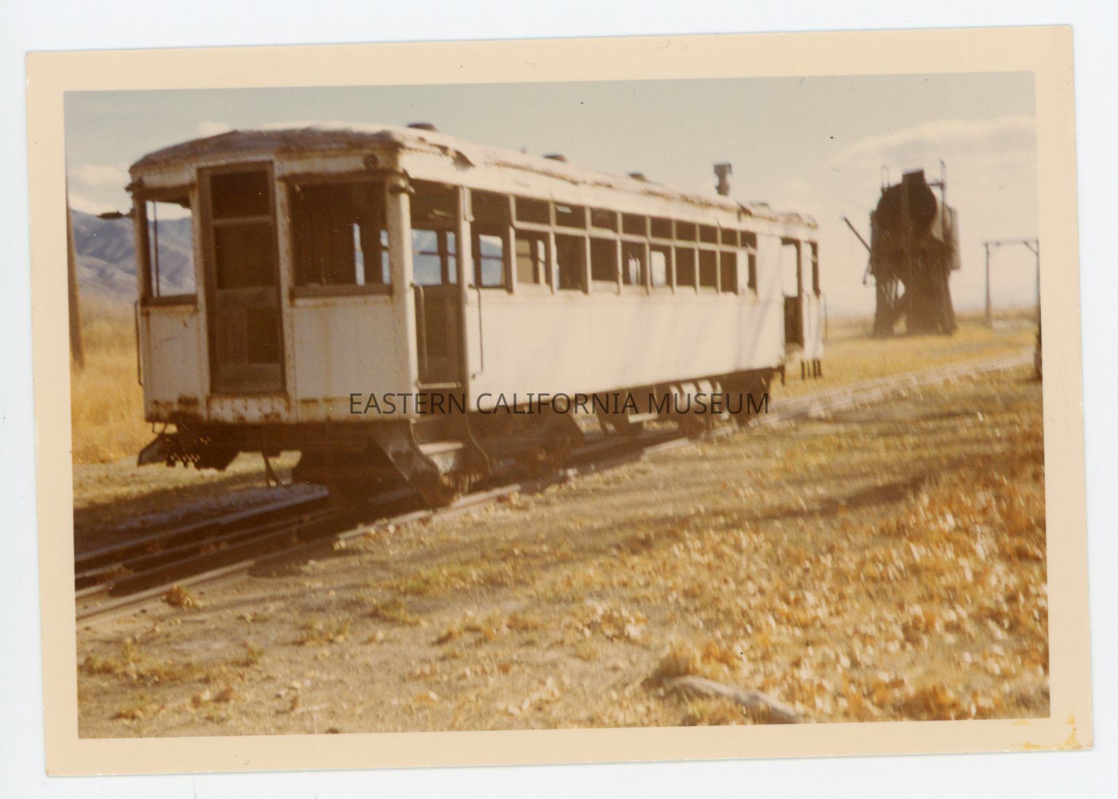 1991.27.1.50--Color photo of a train car (the Galloping Goose or Blue Goose?) sitting on tracks with a water tower in the distance.