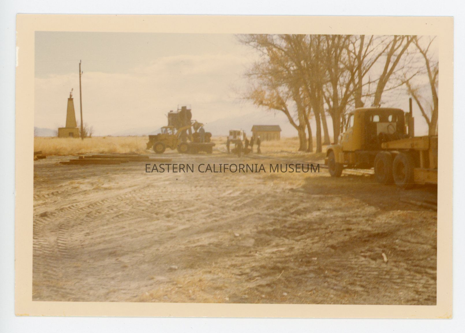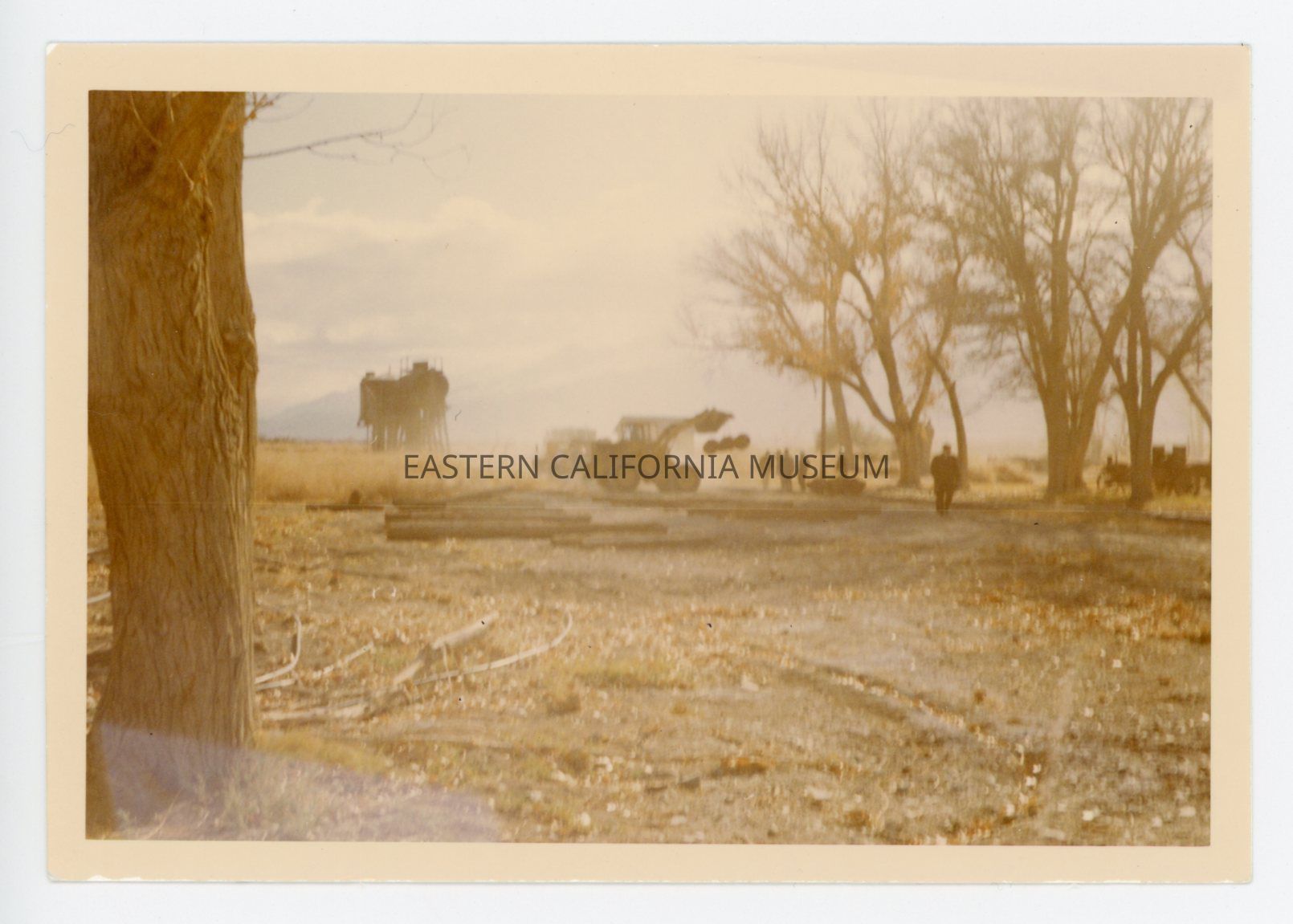 1991.27.1.51--Color photo of heavy equipment at work at Laws, likely to make space for the Galloping Goose or the Blue Goose. The water tower is visible in the background.