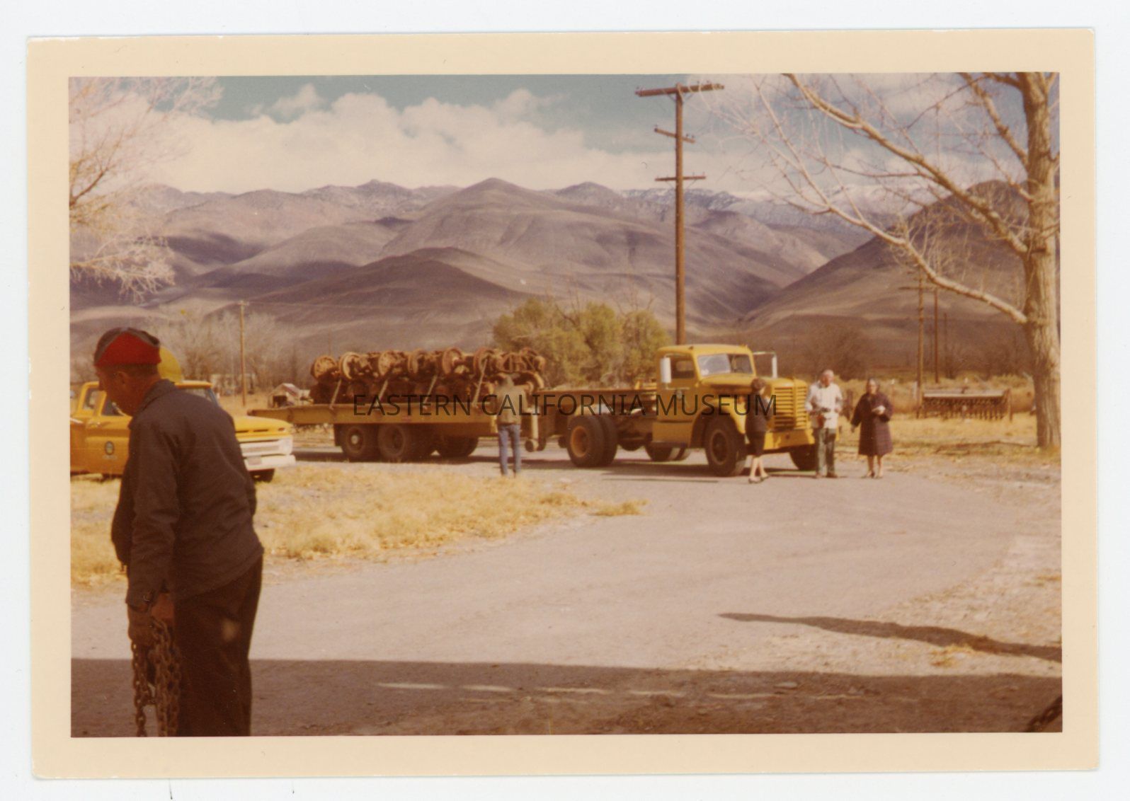 1991.27.1.47--Color photo of a flatbed truck hauling what may be train wheelsets or other machinery. There are five people standing around in the photo.