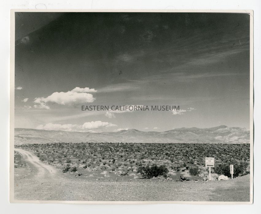 Photograph taken on June 1957 of Padre Crowley Point near Rainbow Canyon as you enter Panamint Valley. Telescope Peak in the Panamint Mountains. Photo shows road sign in English and in Spanish. Named for Right Rev. Monseigneur John J. Crowley, Catholic Priest who loved to go to this place.Collection