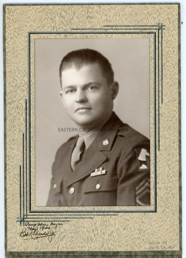 Mounted photograph of a young man in uniform. It is labeled, "Camp Adair, Oregon, May 1944, Bob Richards, Jr." The mounting can fold to become a standing frame.