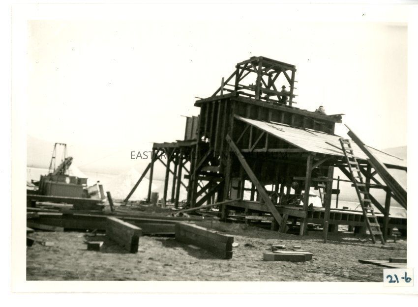 B/w photo of a wooden structure (terminal?) and piles of building materials. There is a huge pile of salt barely visible in the background.
