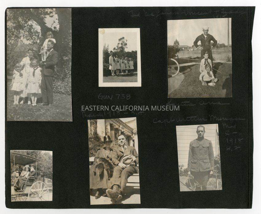 A1831.6.57c: Photo of a man in a sailor uniform with two young boys. They are standing on a grassy front lawn. Written on album page above is, "Ted McGahan (sp?), Vincent and Teddy, 1918." Written on album page below is, "Santa Ana."