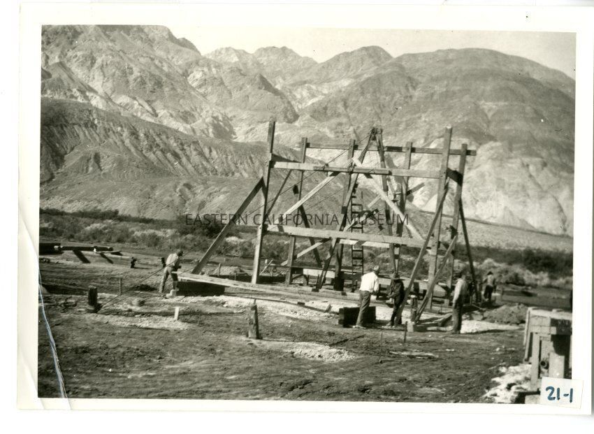 B/w photo of at least five men building a wooden structure (terminal?). Two men are using what looks like a two hand buck saw. Mountains in the background.