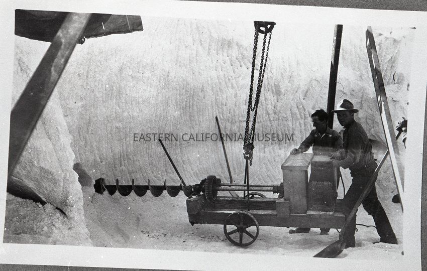 Photo of two men operating a huge drill to bore holes into what appears to be a wall of salt.Collection