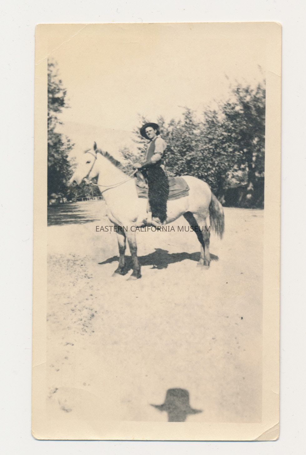 Photo of a man mounted on horseback. He appears to be wearing black, wooly (angora?) chaps.