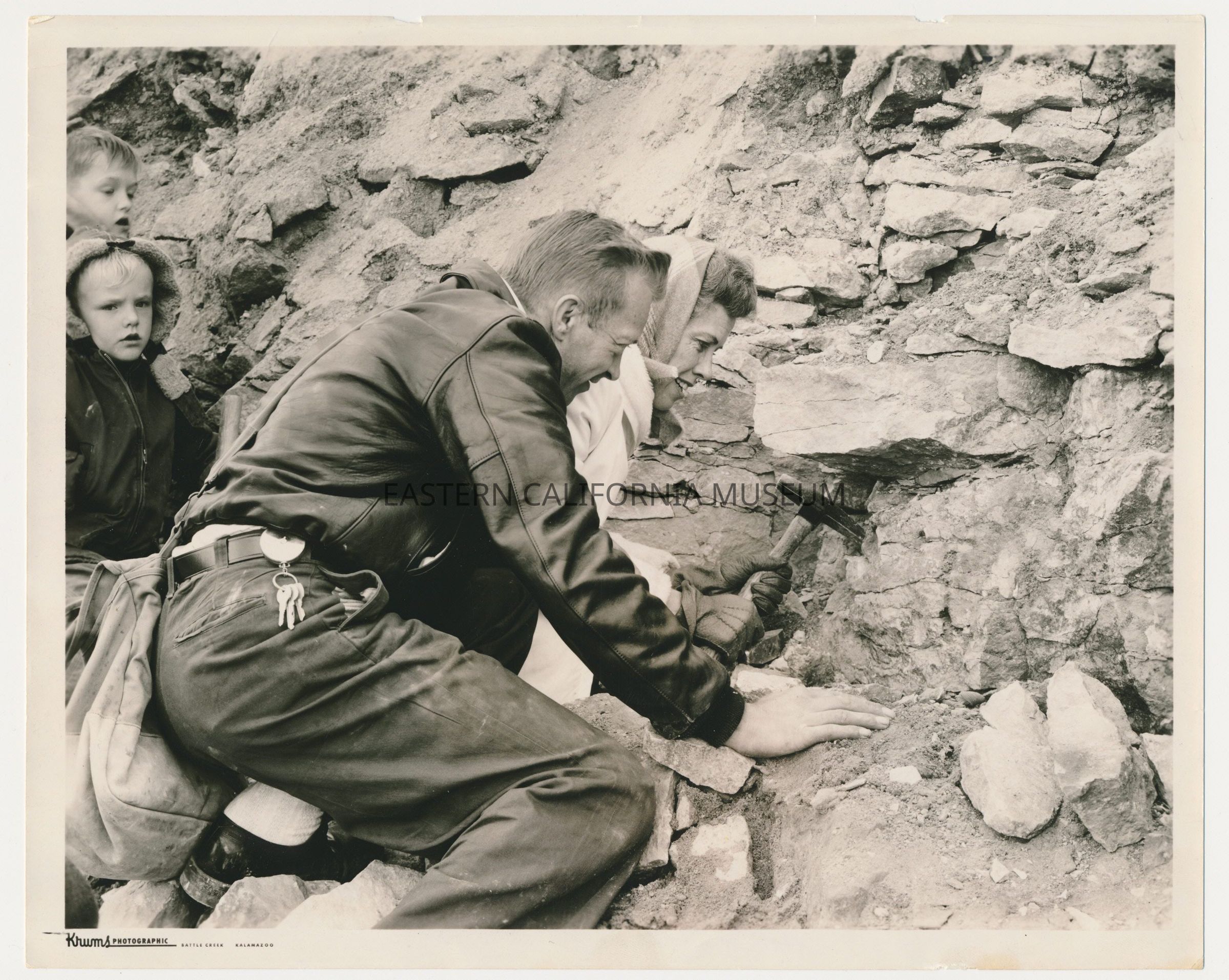 Photo of a man and woman using a pick to excavate rocks or fossils from a cliffside. There are two small children behind them to the left. They may be Genevieve Parcher and Frank Parcher. The photo was printed by Krums Photographic in Battle Creek, Kalamazoo.