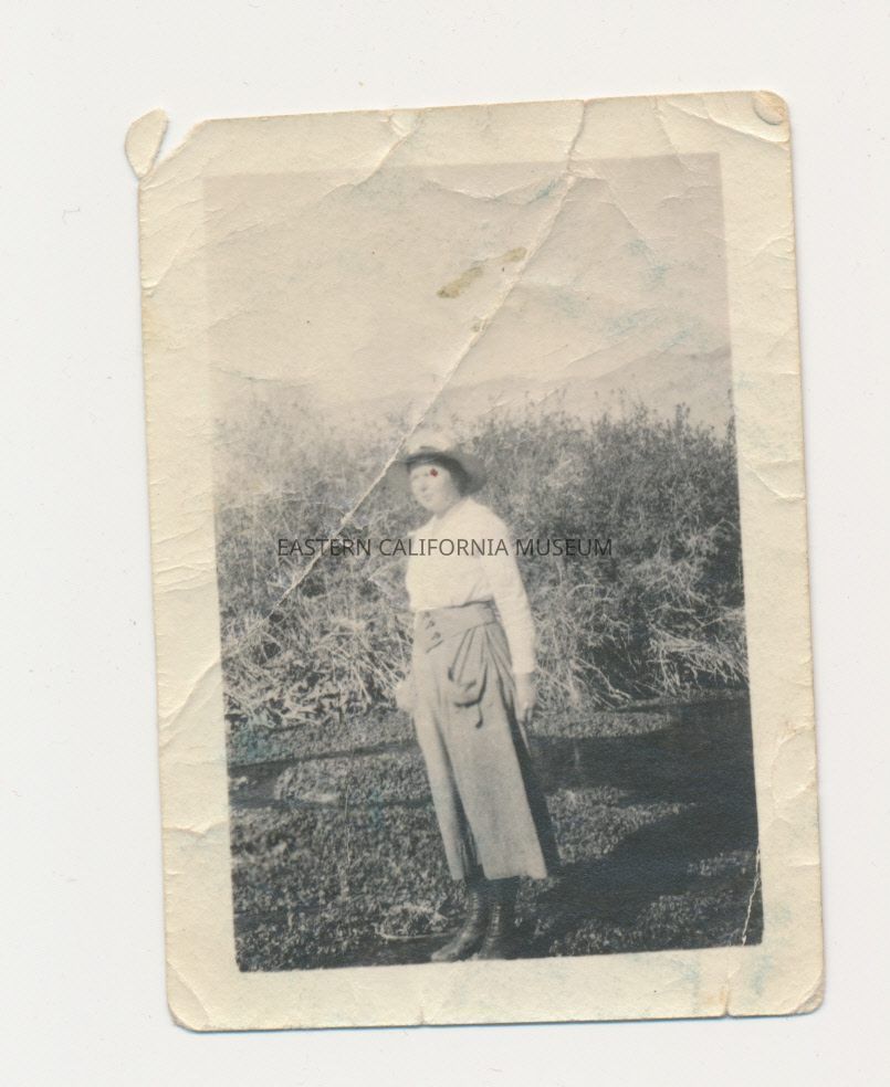 Photo of a young woman standing outside. Written in blue ink on reverse: Ora Drew. Written in pencil on reverse: About 1920.