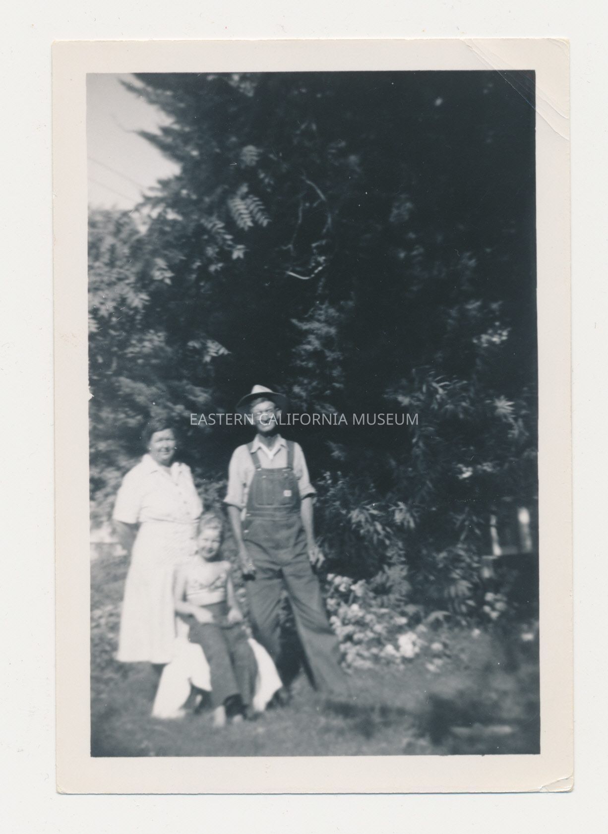 Photo of three people posing outside on a grassy lawn. Written in pencil on reverse: Ora, Grover, and Thelma Smith. July 31, 1949.