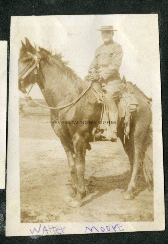 Man astride a saddled horse. Handwritten label identifies man as Walter Moore. He might be wearing a uniform.