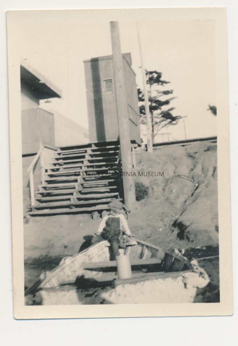 Photo of a young boy sitting on the edge of a little boat or dinghy. Photo was printed by Frasher's in Pomona ("Frashertone").