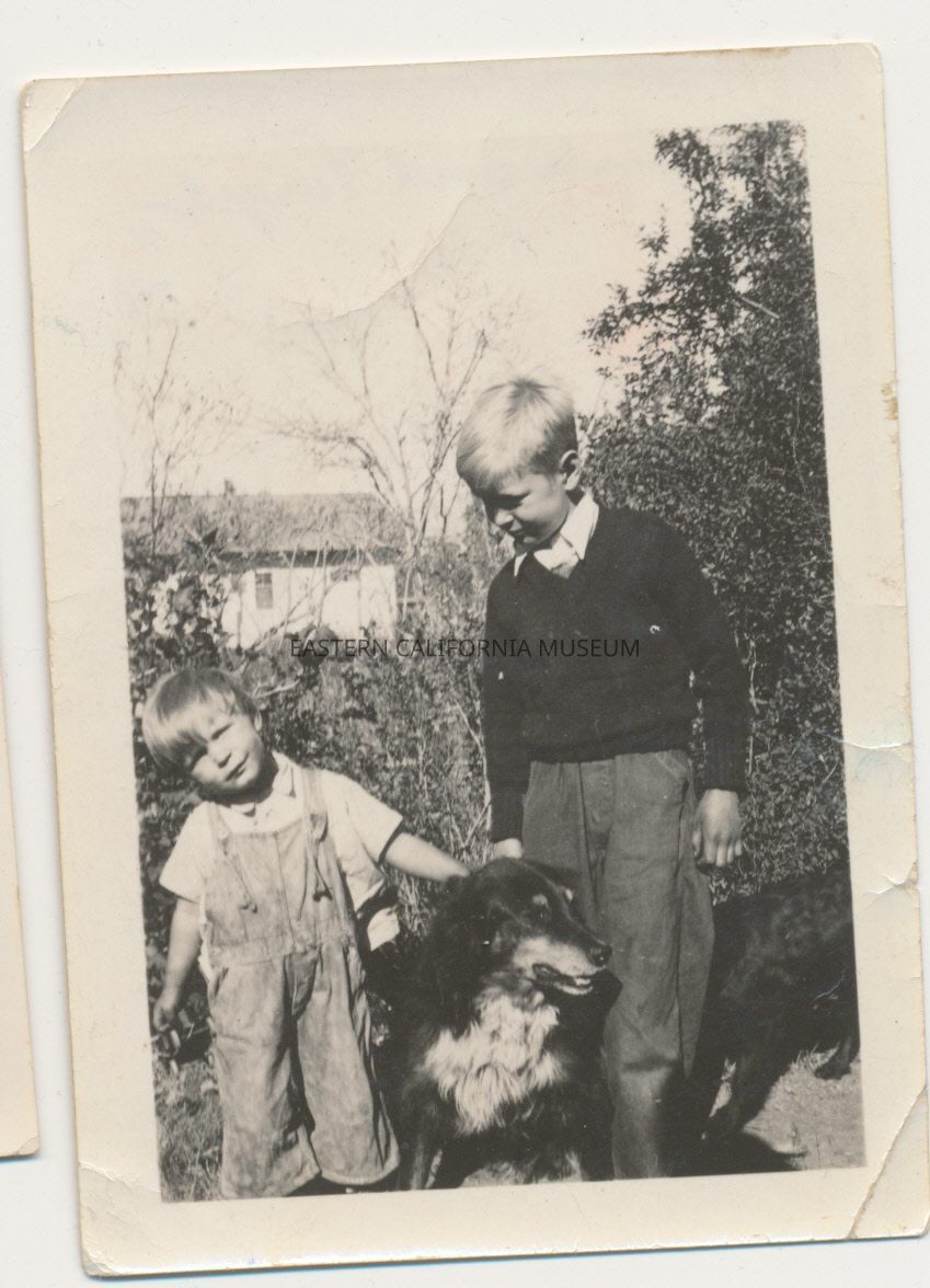 Photo of two young boys with a black and white dog. Written in black ink on reverse: Marvin and Virgil. Stamped in blue ink: Nov. 20, 1933.