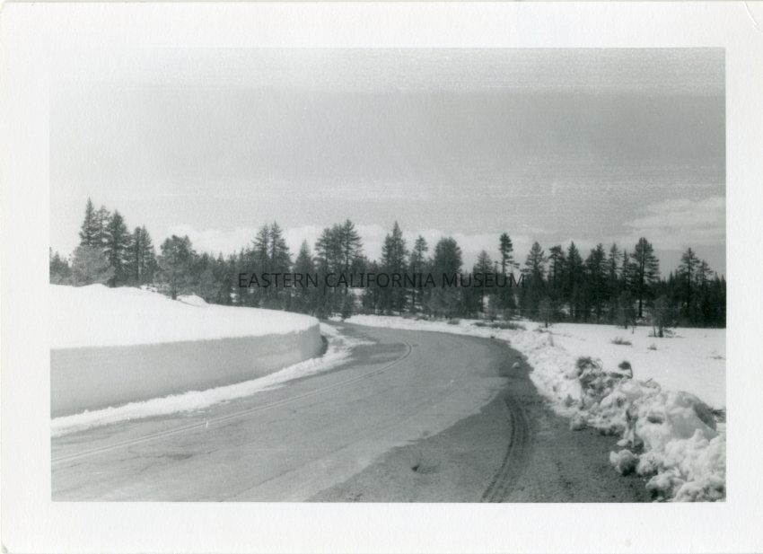 B&W matte print: paved road wih plowed embankments