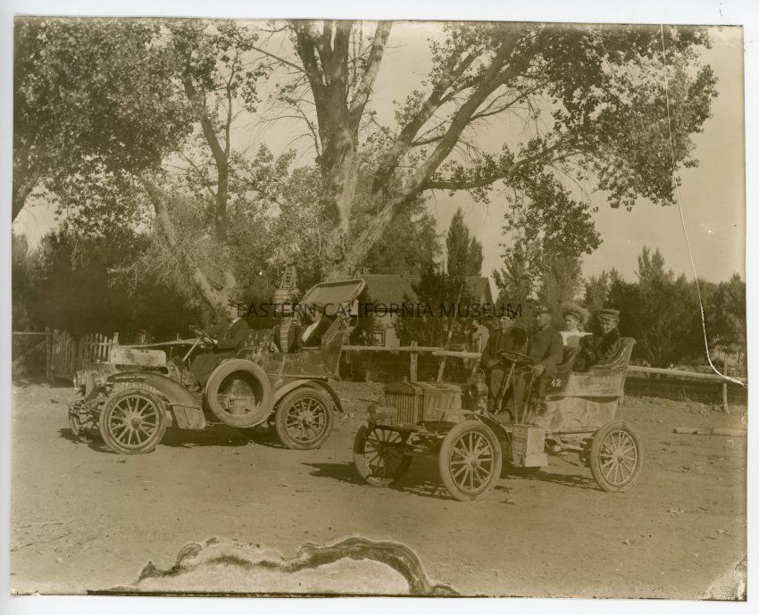 Photo with discoloration around base showing two open-air vehicles with people in them. There are houses, trees, fences, and dirt road visible. The car on the right has the number 42 on its side, and some writing that is illegible.