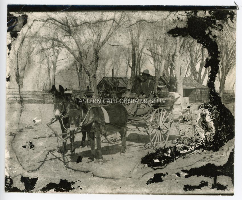 Photo with extensive black discoloration showing a man driving a wagon pulled by two mules/donkeys/burros/whatever. Many trees, fences, dirt road, buildings visible.