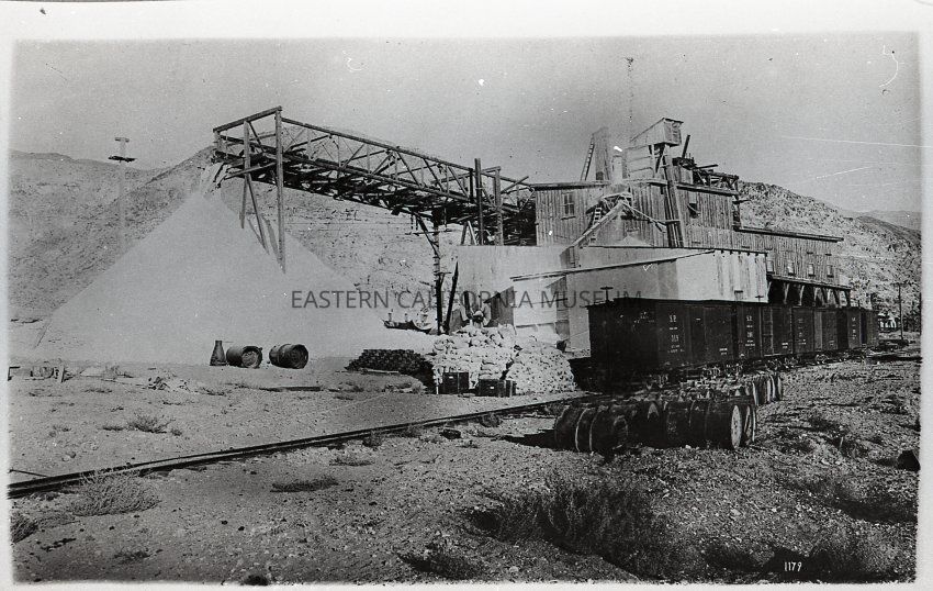 Photo of a building or station built and used by the Saline Valley Salt Co. There is a huge pile of salt on the left. Railroad tracks and Southern Pacific boxcars in front of building. In lower right corner is a label that says, "1179."Collection