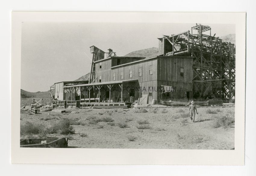Photo of a large building built and used by the Saline Valley Salt Co. There is a man walking towards the camera.Collection