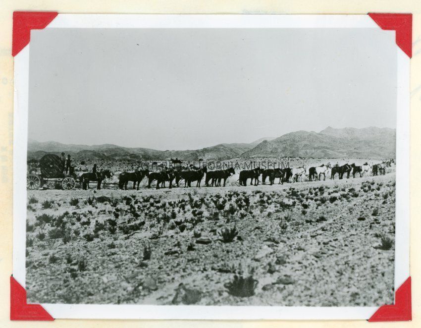 Photo of three unidentified freighters and team of horses [24 total?] hauling cable up the Yellow Grade Road to Cerro Gordo tramway about 1910. Photo copied courtesy of L. Hilderman in 1959.