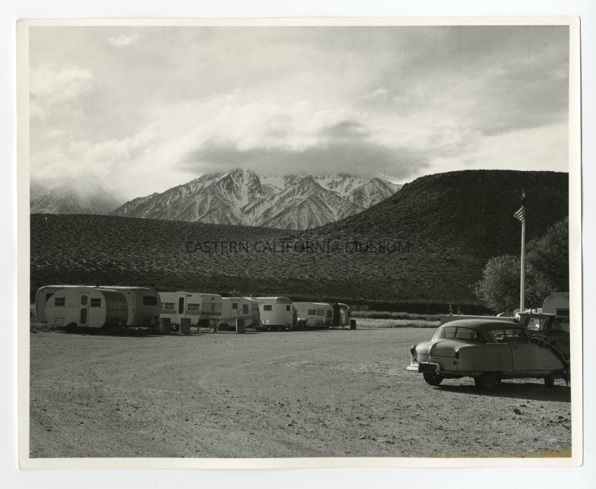 Photo of Pleasant Valley campground with vehicles and RV trailers parked along a dirt road. Photo likely by Tom Ross.