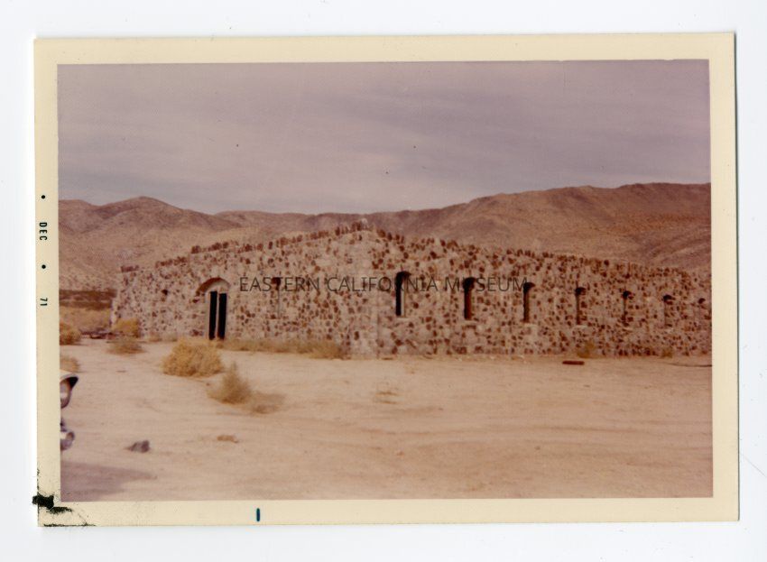 Color photo of a stone building in the desert. Written in blue ink on reverse: Coso Hot Springs, museum trip, 1971.
