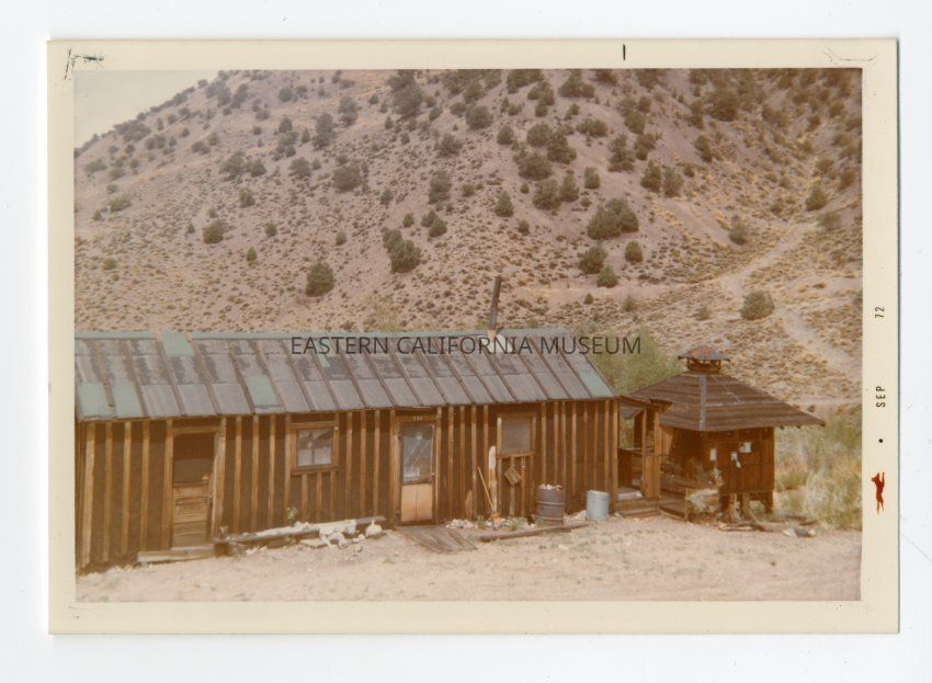 Color photo of a cabin (looks similiar to Manzanar barracks). Written in blue ink on reverse: Queen's Canyon, 1972.