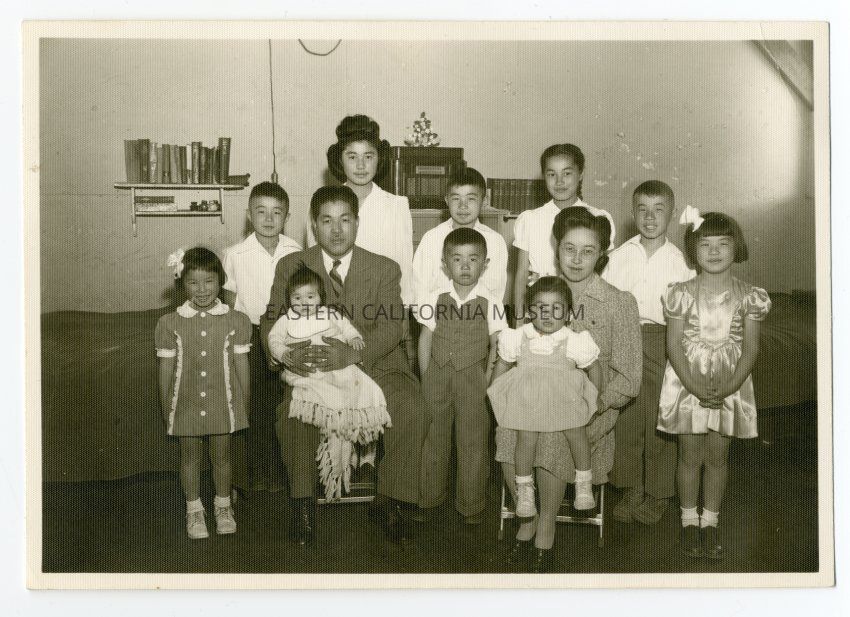 Interior photograph of a family inside an apartment in barracks. Two adults and 10 children. They are identified on the reverse as the M. Fujino family.Photograph Details