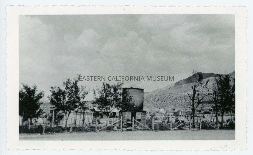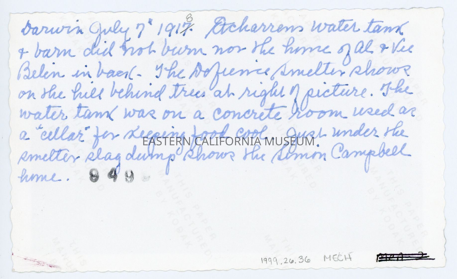 Handwritten on reverse: Darwin July 7, 1917 [crossed out and replaced with 1918]. Etcharren's water tank and barn did not burn or the home of Al and Vie [sp?] Belin in back. The Defiance smelter shows on the hill behind the trees at right of picture. The water tank was on a concrete room used as a "cellar" for keeping food cool. Just under the smelter slag dump shows the Simon Campbell home.Collection