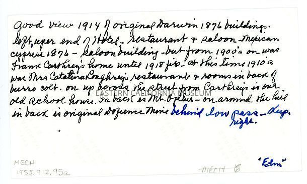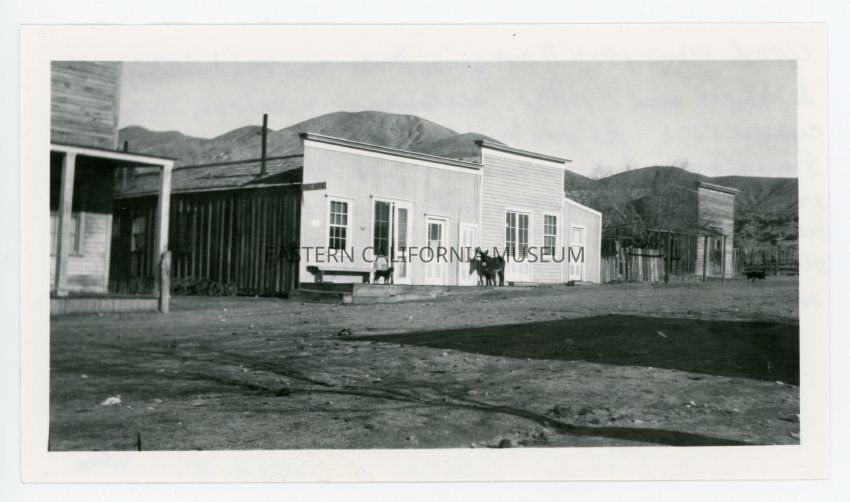 Written in black ink on reverse: Good view 1914 of original Darwin 1876 buildings. Left upper end of hotel, restuaruant, and saloon--Mexican cypress 1876--saloon building--but from 1900s on was Frank Carrhrey's home until 1918 fire--at this time 1910s was Mrs. Catalina Longhrey's restaurant and rooms in back of burro colt. On up across the street from Carthrey's is our old school house. In back is Mt. Ophir--on around the hill in back is original Defiance Mine behind low pass--keep right. ELM.