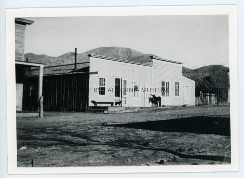 A photocopied paper written by Elizabeth Mecham says: 1916. Upper corner of old hotel--then Mrs. Loughrey's restaurant and rooms--originally restaurant and saloon 1870s--then the tamarisk tree by Frank Catherey's home (now Out Post) and it was a store in old days--old cellar was on corner lot. Jennie (Jean) Catherey's room is behind the fence--beautiful old mahogany marble top furniture brought in for Defiance Mine--original claim--all burned in 1918 fire--for years Frank Carthery was caretaker of Defiance property--smelter, pipeline and water--and soon it was a constant fight to get water! We kids used to go out on the line with him on Saturdays and he wrapped the leaks in original 4" rivited pipe--with canvas and bailing wire--the came the Model T and inner tubes and bailing wire.