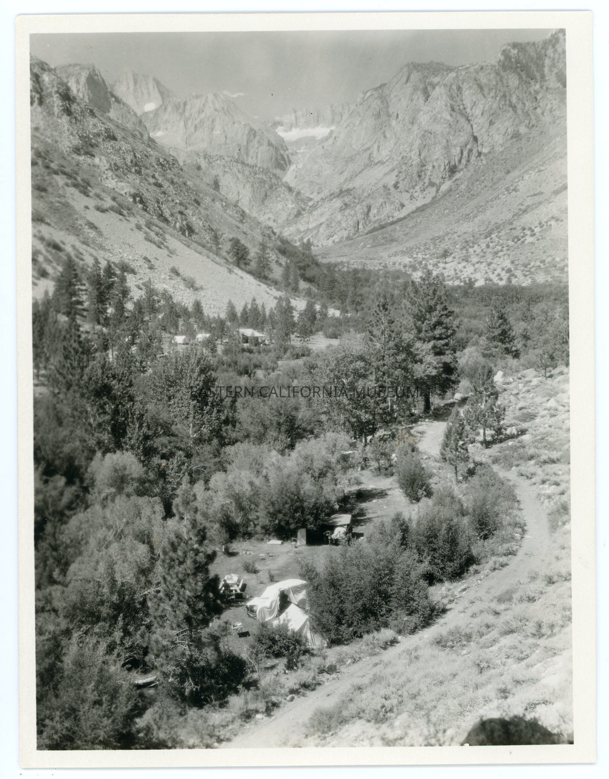 Photo of Big Pine Canyon and the Glacier Lodge area taken by photographer Harry W. Mendenhall. It shows a dirt road, tents, picnic table, and at least one person in the campsite area.