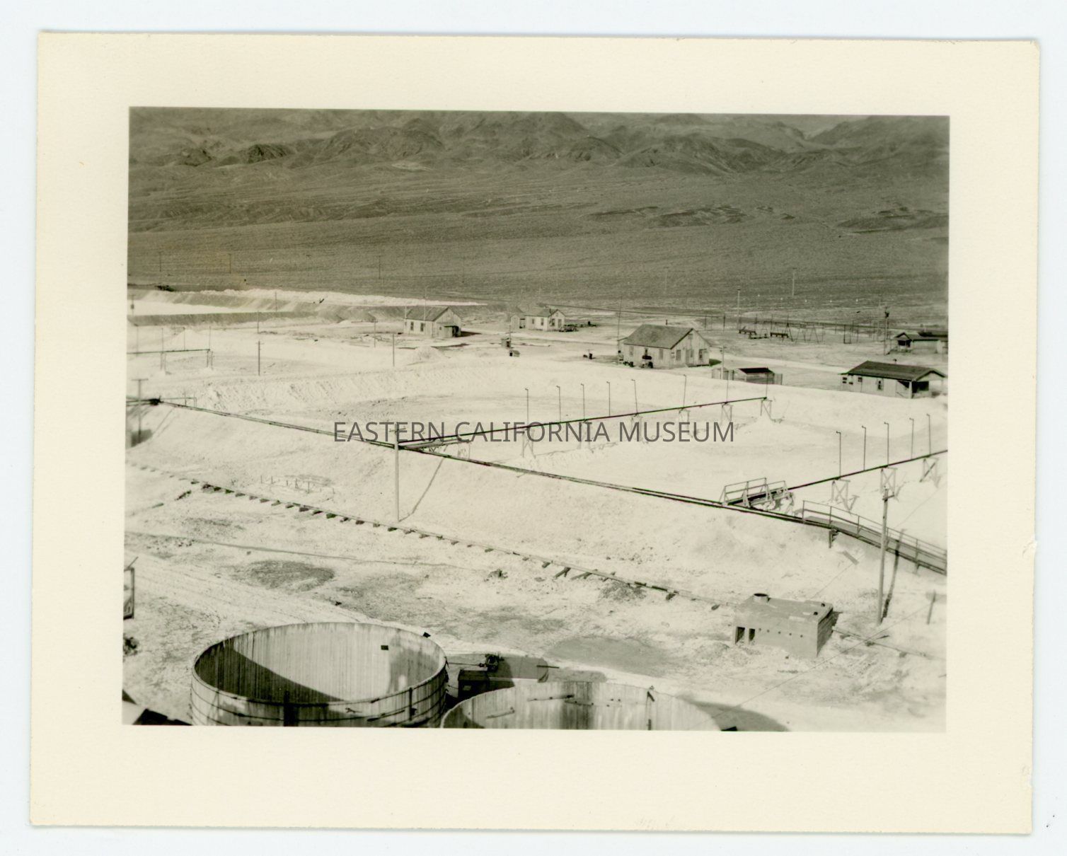 Photo of the vats at the Natural Soda Products (NSP) plant near Keeler on the Owens Lake. There are many buildings visible beyond the vats. Photo likely taken in the late 1940s.