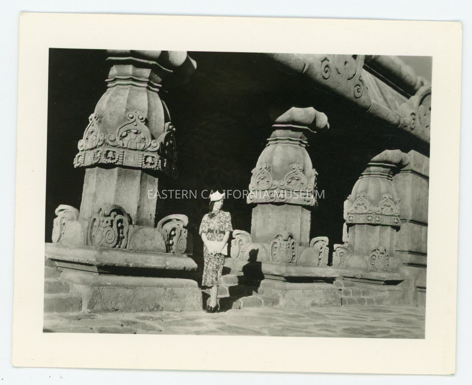 Photo of a woman standing next to elaborate columns. It is a movie set in the Alabama Hills that was constructed in 1938.