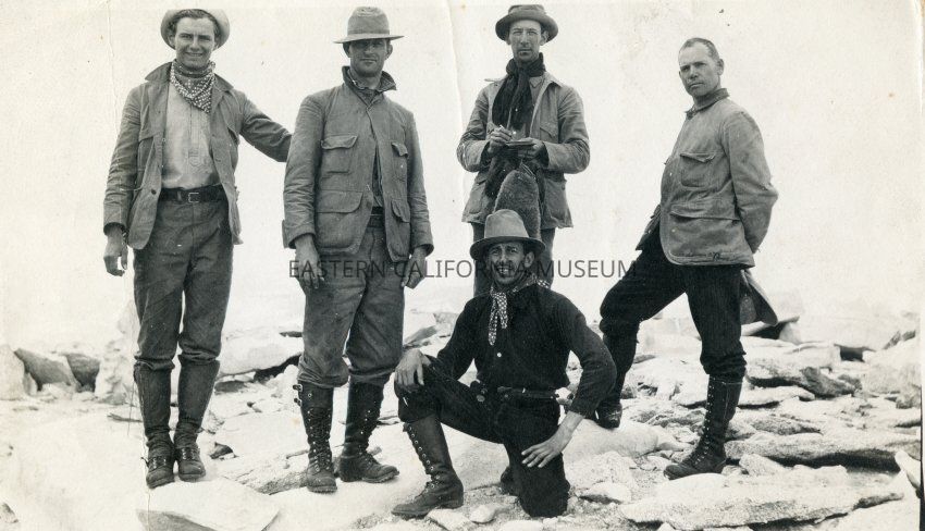 Identified by donor as: Top of Whitney 1913. Howard Whitney (2nd from right) and Herb Jago (far right) and unknown hiking companions.