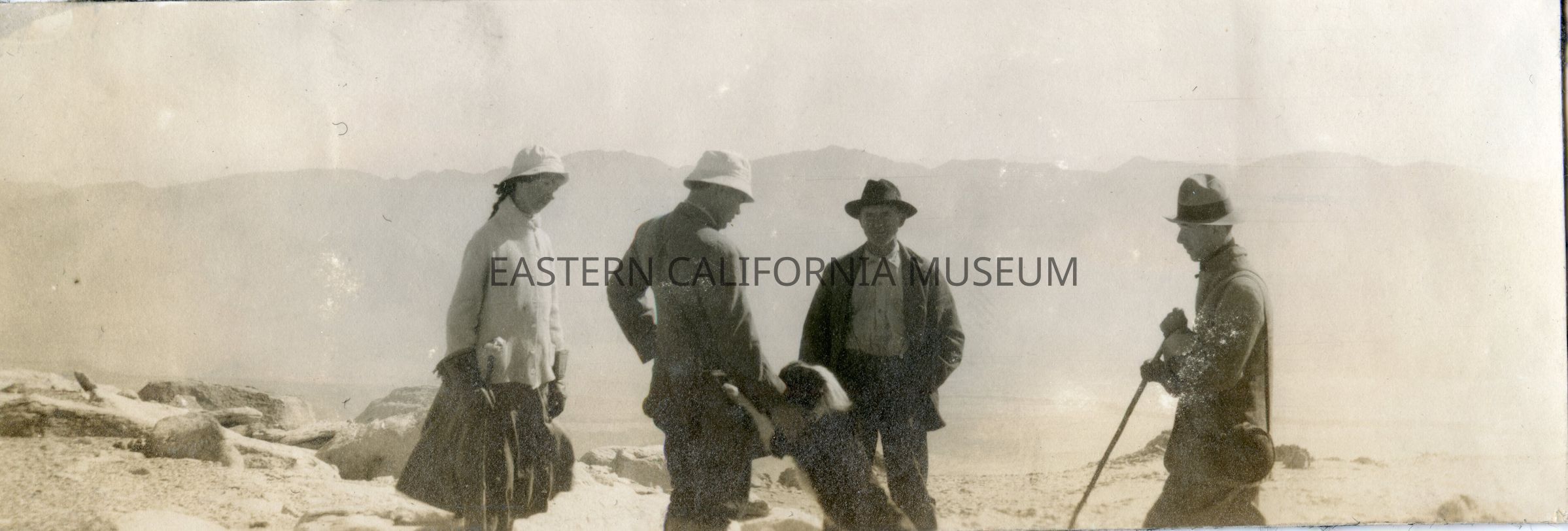 Photo of four people (one woman on the left and three men) and a dog with mountains in the background.