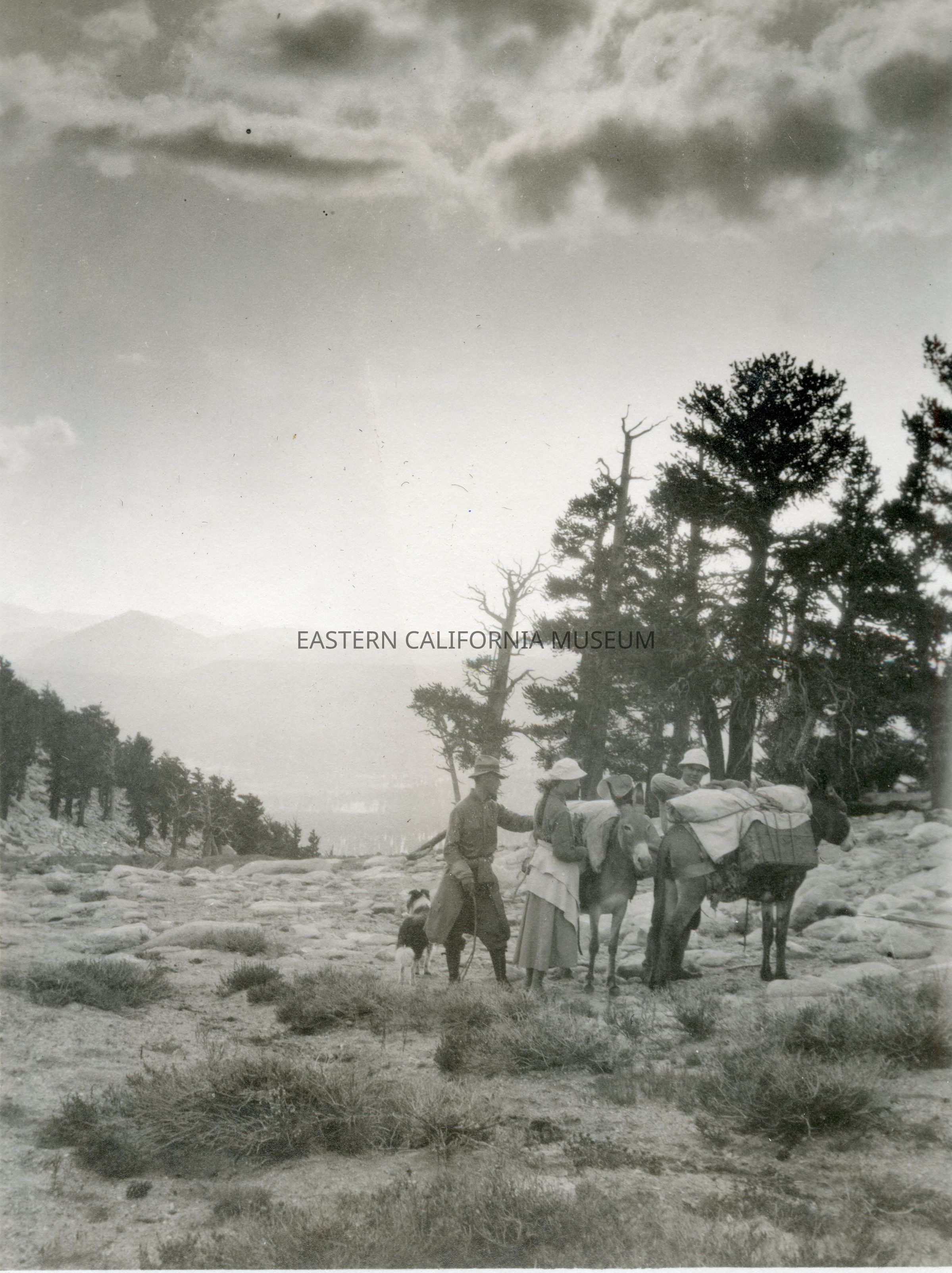 Photo of three people posing with two pack mules and a dog.