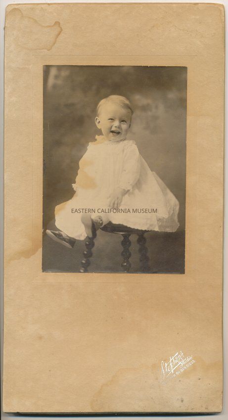 Mounted photogrpah of a baby sitting on a stool. Smiling or laughing. Stephens Studio, 911 Fifth St., San Diego. Some water damage and warping.