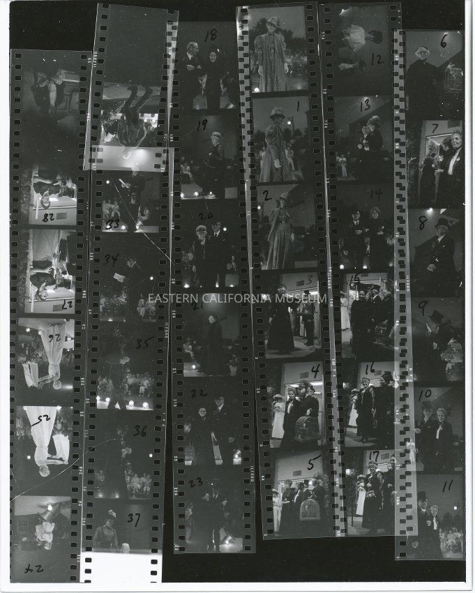 Proof sheet of six stripes of 35mm film in black and white. Each individual image has a number written in black marker. Example of marking is as follows - right hand side:6.7,8,9,10,11. Number 6 is a women facing the camera (low view), smiling and holding a bird cage.