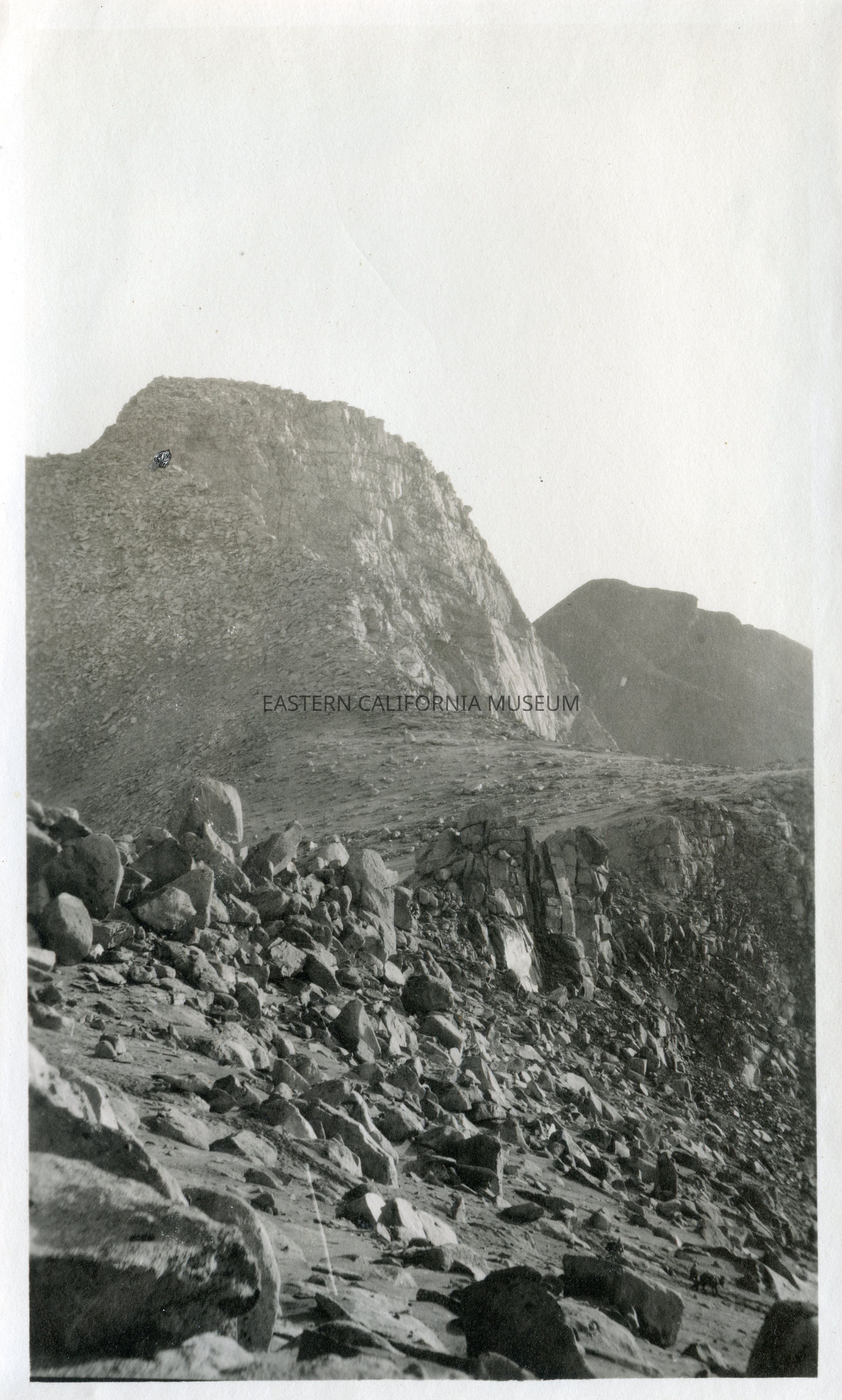 Photo of a mountain peak with a desolate field of boulders in the foreground.