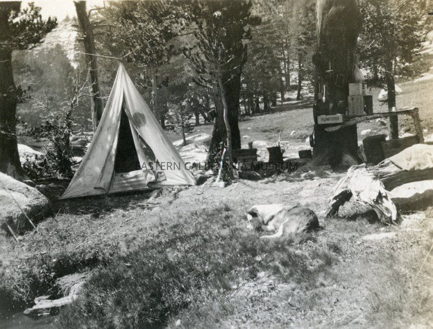 Photo of a campsite with canvas tent and supplies spread about.