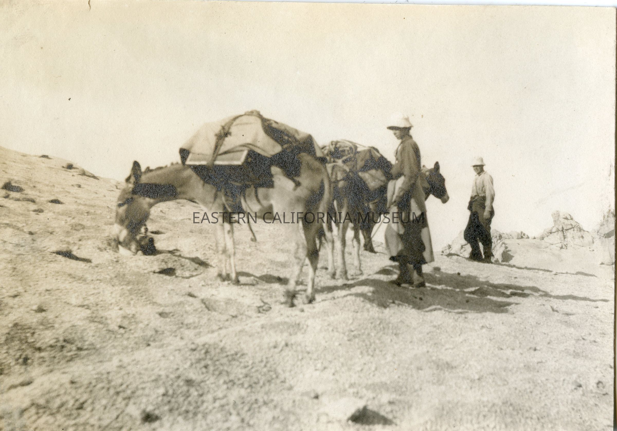Photo of a woman and a man with pack mules.