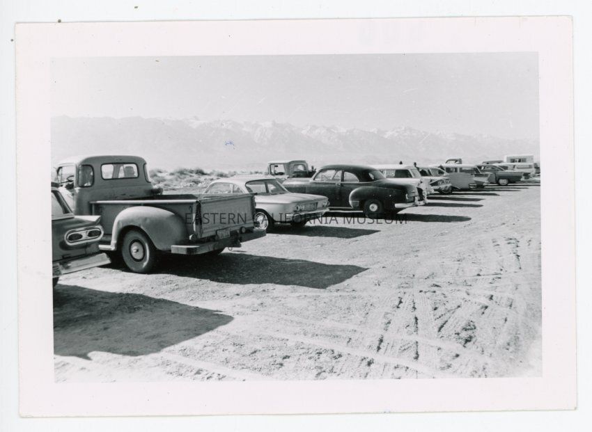 Photo of cars parked along road at the dedication of the Swansea monument.