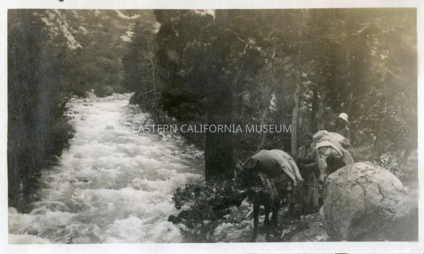 Identified by donor as: 1914 - Patti George in front with pack mules - unknown location, unknown woman