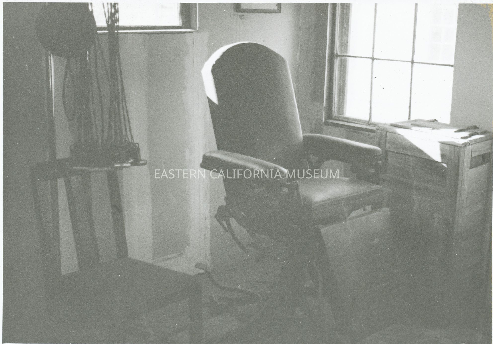 Black and white interior shot of a dentist's chair near a window. To the left is a coat rack with a hat on it. Wires with small metal cylinders at the end are hanging down from the ceiling (possibly what was used in the beauty treatment of women). Between the window and dentist chair is a wood ice box (which is on loan to the Museum of Western Film History).