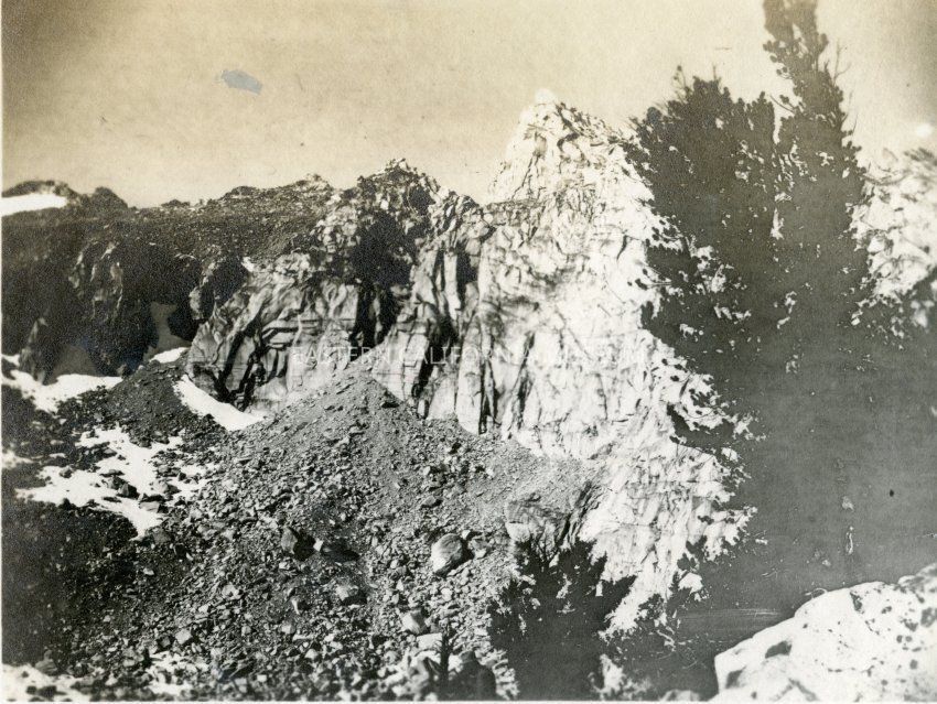 Photo of a rocky mountainside. There is a tree in the right foreground.