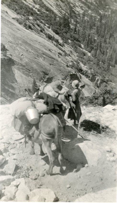 Photo of the backside of a mule and a couple people descending down a trail or hillside.