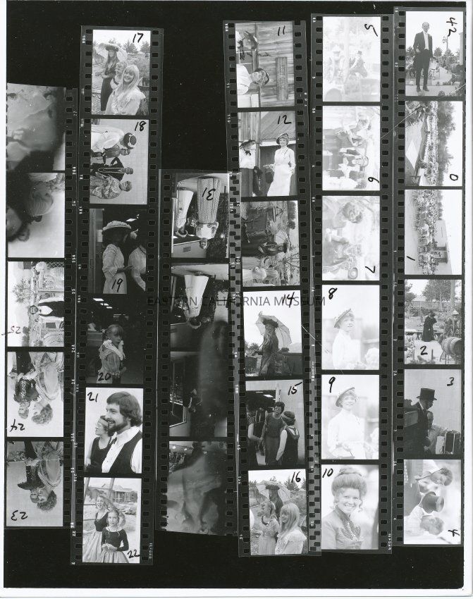 Proof sheet of six stripes of 35mm film in black and white. Each individual image has a number written in marker. Example of marking is as follows - right hand side: 42, 0, 1, 2, 3, and 4. Number 42 is of a man in a tuxedo standing outside on a stage.