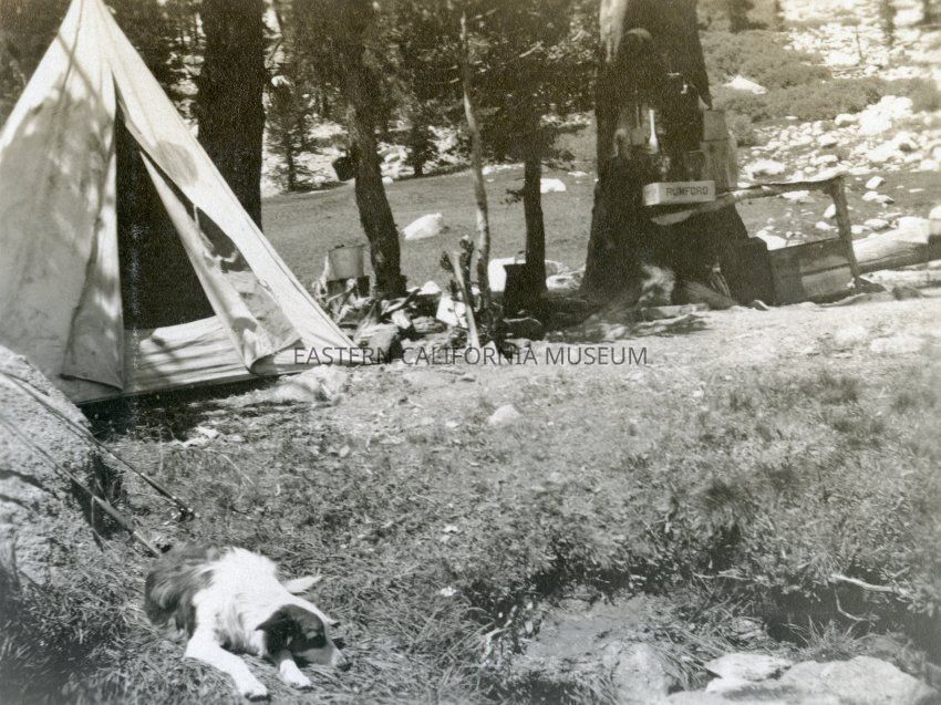 Photo of a campsite with a canvas tent, supplies, and a dog.